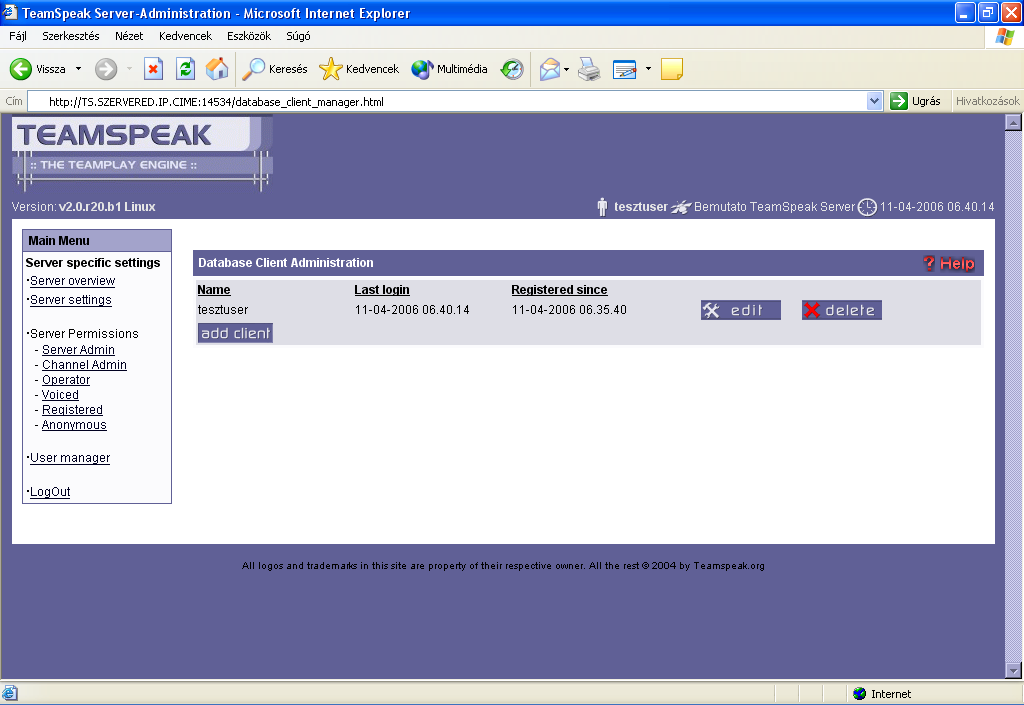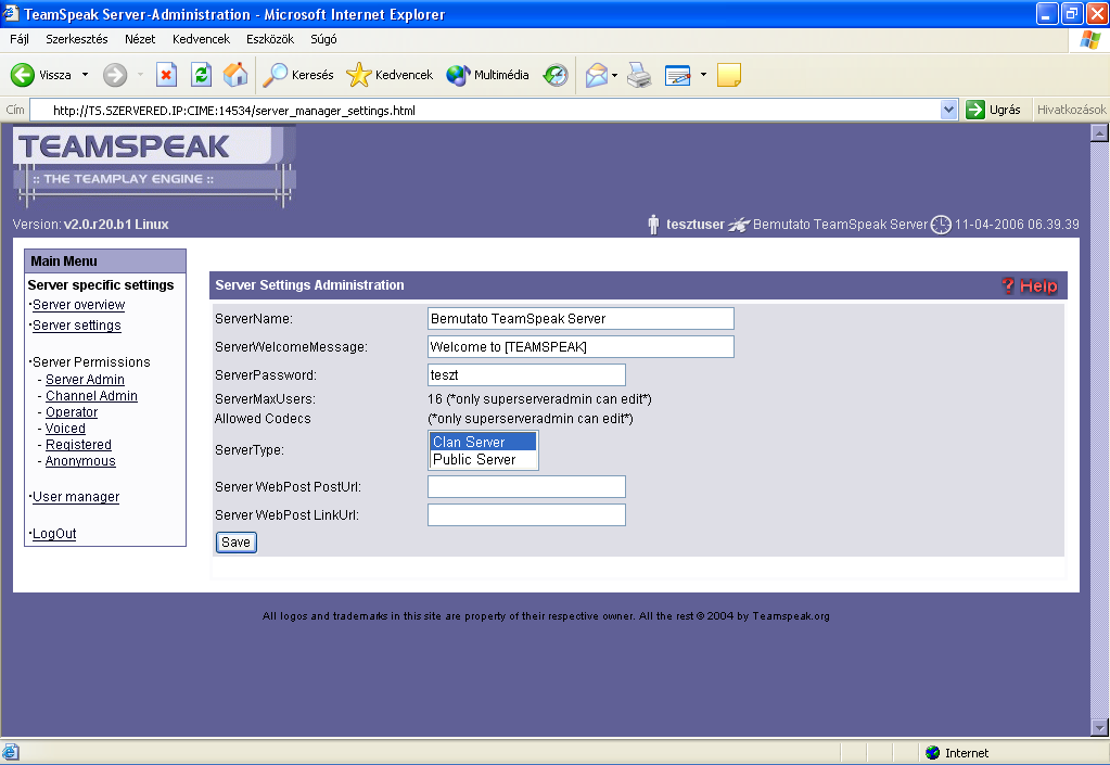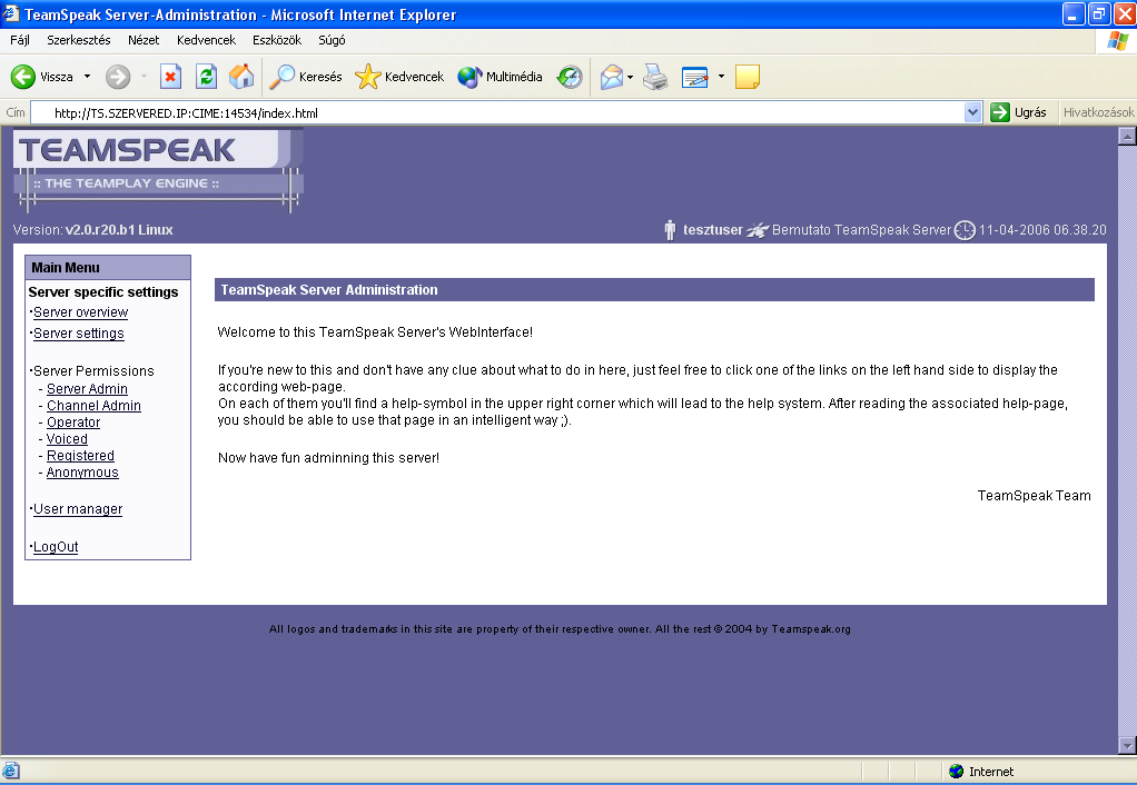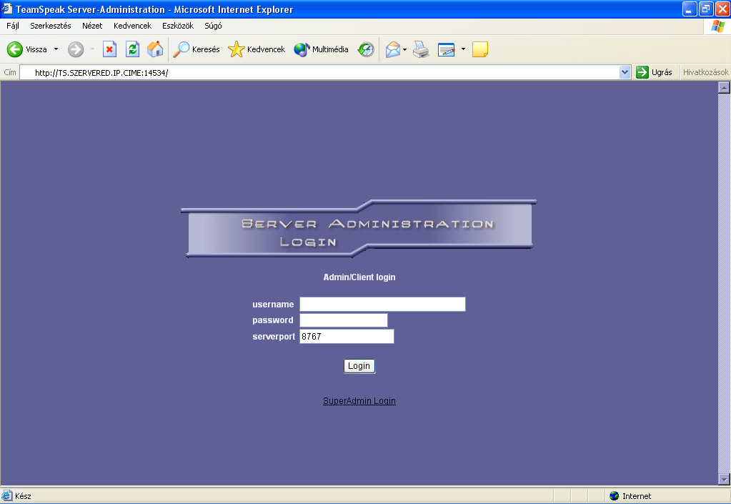 Ha neked pl.a Team Speak szervered IP cÃme: 62.112.194.67, akkor a következ?ket kell beÃrnod a böngész?d cÃmsorába: http://62.112.194.67:14534.