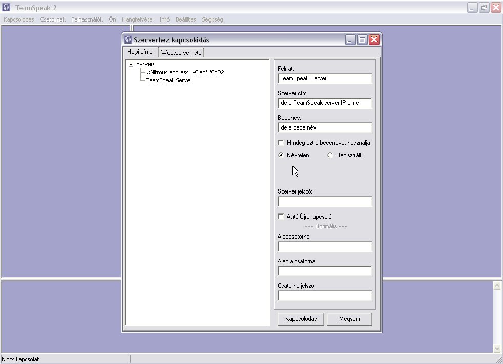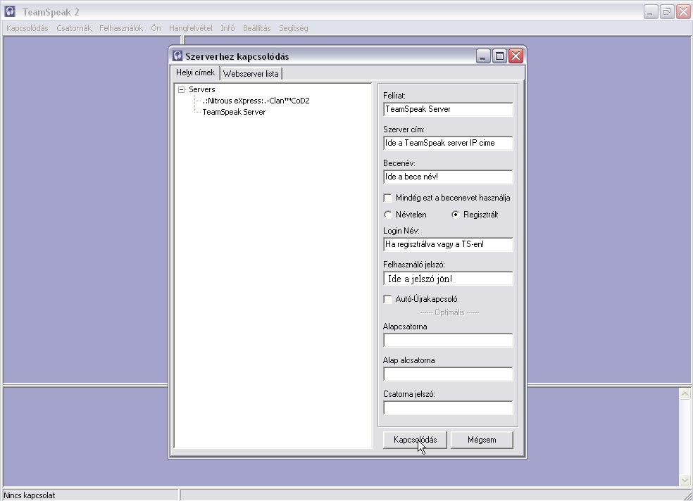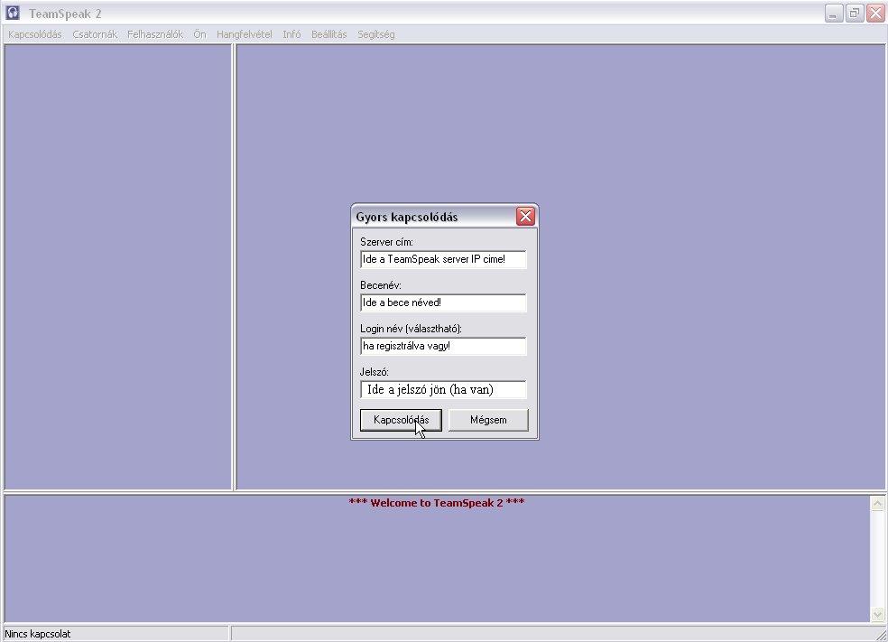 3. A szerverhez való kapcsolódás! Menü: Kapcsolódás => Kapcsolódás vagy Gyors Kapcsolódás de mindkettõt elmondom, hogy kell!